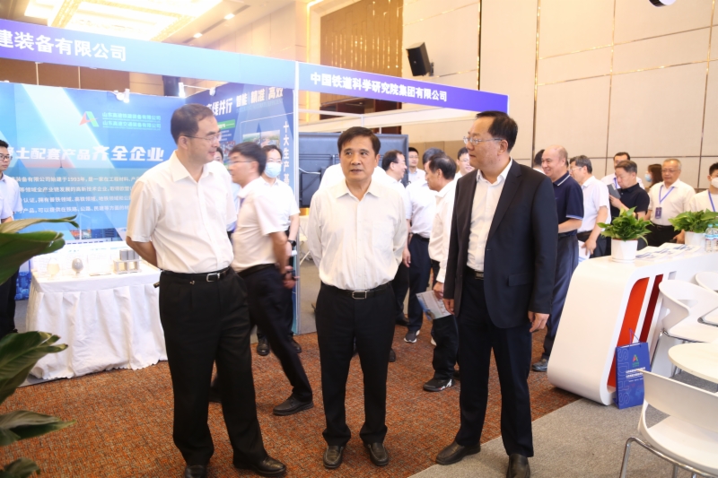 會議期間,黃民一行到集團展廳及會議現場展區參觀交流,集團推出的山東鐵路智能化建設管理平臺、CRTSⅢ型板式無砟軌道智能施工技術與裝備引得眾人關注。山東鐵路智能化建設管理平臺是以數字技術賦能高鐵智能化建設的重大成果,該平臺包含從設計到施工再到運營階段36個板塊、390多個功能模塊,實現了鐵路建設全生命周期管理,形成了“一張圖、數字化、智能化、可視化”的管理特色。平臺已在濟濱高鐵項目全面推廣應用,取得了良好成效,累計產生數據量70余萬條,活躍用戶8000多人。CRTSⅢ型板式無砟軌道智能施工技術與裝備是指CRTSⅢ型板式無砟軌道“測量-調整-支護-灌注”一體化施工裝備,并與配套施工工裝之間無縫銜接,能夠提高施工效率50%以上,減少人力1/3以上,實現施工全過程質量可控,并可拓展到其它類型無砟軌道施工中。