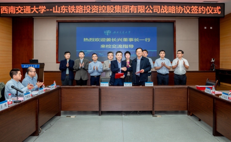 在西南交通大學,校長楊丹對姜長興一行表示歡迎,對雙方開展戰略合作給予充分肯定,并希望在科技成果轉化、人才培養等方面開展深度合作。科研院副院長、川藏辦副主任王鷹教授介紹了學校情況和科研工作情況,產業處、土木工程學院、電氣工程學院、牽引動力國家重點實驗室、交通運輸物流學院、交大設計院、唐源電氣、運達科技、鐵發公司等負責人分別介紹了情況,并就雙方可能合作的領域進行了交流,在科技成果產業化、產業合作等方面形成了共識。姜長興在講話中指出,與西南交大開展戰略合作協議,是雙方落實習近平總書記科技強國、交通強國重要論述的具體行動。西南交大技術底蘊厚、創新能力強、科技轉化率高,很多新技術、新材料業內領先。山東鐵投擁有龐大的鐵路建設市場,愿意成為西南交大的“露天實驗室”,雙方合作大有可為。會上,姜長興同志、楊丹同志分別代表雙方簽訂戰略合作協議,并向何川、楊榮山等五位專家頒發聘書。