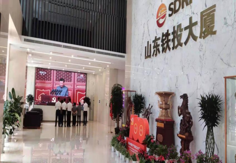 鐵航物業(yè)公司員工在山東鐵投大廈一樓大廳收看大會(huì)