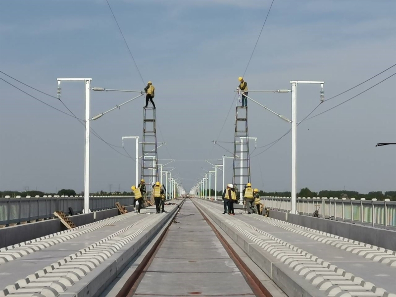 濰萊高鐵全線設(shè)計(jì)承力索284.95條公里,正饋線219.37條公里、保護(hù)線219.37條公里、回流線3.762條公里、供電線56.41條公里,各類支柱4797根,硬橫跨20組,預(yù)計(jì)6月底完成。