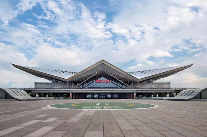 濰坊是中國風箏文化重要的傳承地,自古有“鳶都”的美譽。濰坊北站站房造型從傳統的盤鷹風箏汲取靈感,主立面以簡潔有力的折線勾勒出雄鷹展翅欲飛的動勢,支撐大屋面的結構構建穩定而纖細,寓意風箏的絲線,充分彰顯地域特色。