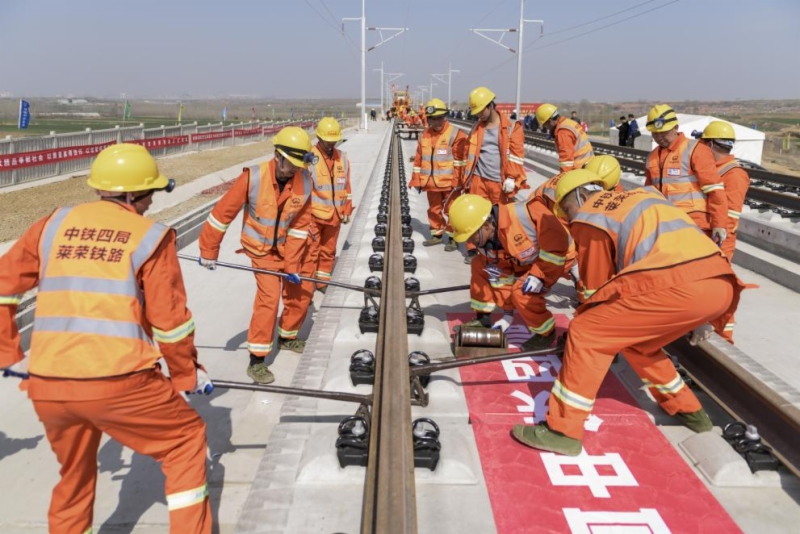 萊榮高鐵正線長度 192.814km,其中鋪設無砟軌道地段 180.999km。自2022年3月下旬無砟軌道工程全面轉入線上施工以來,萊榮高鐵公司充分發揮黨建引領作用,精心組織,細化安排,充分優化資源配置,全線高峰時段38個作業面同時施工,作業人員高達1500余人。各參建單位齊心協力克服了工作面多、作業班組多、施工組織難度大、不良天氣頻發和疫情防控等不利因素影響,僅用不足400天時間順利完成全線無砟軌道施工任務。目前萊榮高鐵鋪軌已完成近半,計劃6月初完成鋼軌放散鎖定,7月初開始聯調聯試,10月底具備開通運營條件。