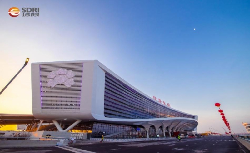 菏澤東站總建筑面積198697㎡,站場共6臺(tái)15線,為高架跨線式,采用“橋建合一”結(jié)構(gòu)形式。該站以“牡丹之都、生命之澤”為主題,以“四澤十水流、盛世牡丹開、迎八方來客”為設(shè)計(jì)立意,采用傘狀鋼結(jié)構(gòu)落客雨棚、一體化屋面掀起高窗、工字收腰內(nèi)凹立面,體現(xiàn)當(dāng)?shù)氐赜蛭幕厣:蕽蓶|站站房頂部帶型天窗采用層層掀起的造型,通過流線造型展現(xiàn)“水”的歷史文脈。站房站區(qū)生產(chǎn)生活房屋按照“一站一景、站城融合”的理念傾心打造,與站房建筑外觀和諧統(tǒng)一,與周邊環(huán)境交相輝映。