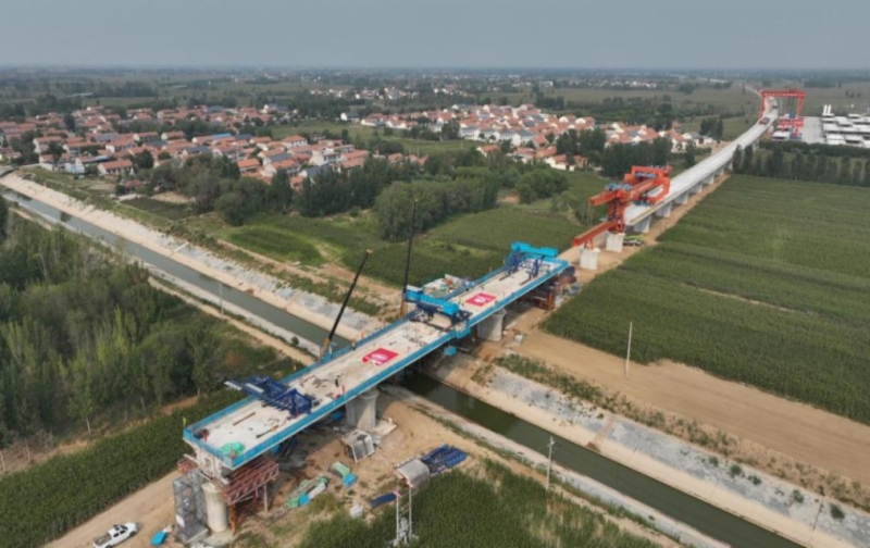 該連續梁位于濱州市濱城區楊柳雪鎮,全長113.5米,采用(32+48+32)米連續梁結構。為確保連續梁順利合龍,山東鐵投集團濟濱高鐵公司和中鐵二十四局克服施工環境復雜、環保要求高等難題,精心研究編制專項施工方案,緊盯施工關鍵環節,現場安排專人對合龍段模板安裝、鋼筋綁扎、混凝土澆筑等工序進行檢查驗收,強化現場安全技術保障,選定在凌晨氣溫低、溫差小的時間段進行混凝土澆筑,保證各項控制指標符合規范要求,確保橋梁合龍質量。