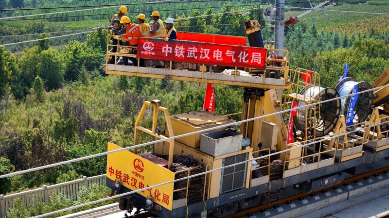 上午9時(shí),在濰煙高鐵DK154+443施工現(xiàn)場(chǎng),隨著現(xiàn)場(chǎng)負(fù)責(zé)人一聲令下,恒張力放線車緩緩啟動(dòng),在作業(yè)車和施工人員的配合下,經(jīng)過(guò)起錨、放線、滑輪懸掛固定、線索終端制作、落錨及中錨架設(shè)等一系列標(biāo)準(zhǔn)化操作,首條接觸導(dǎo)線架設(shè)順利完成。