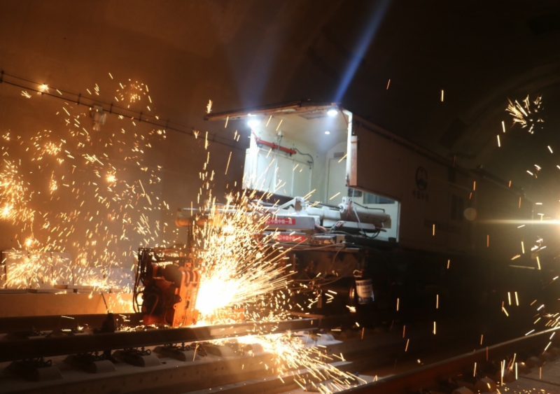 經過施工人員對長鋼軌焊接頭進行除銹、焊接、正火、打磨和探傷等一系列復雜工序后,一根根500米長鋼軌經過單元焊接變為1.5公里的單元軌,再經過鎖定焊及應力放散施工變成無縫線路,不斷向前延伸。