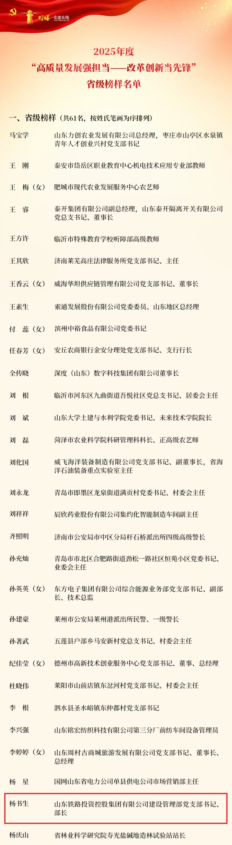7月11日上午,山東省“齊魯先鋒 榜樣有我”榜樣講黨課活動在濟南舉行。現(xiàn)場正式發(fā)布2025年度“高質(zhì)量發(fā)展強擔(dān)當(dāng)——改革創(chuàng)新當(dāng)先鋒”省級榜樣名單。山東鐵投集團建設(shè)管理部部長楊書生入選。